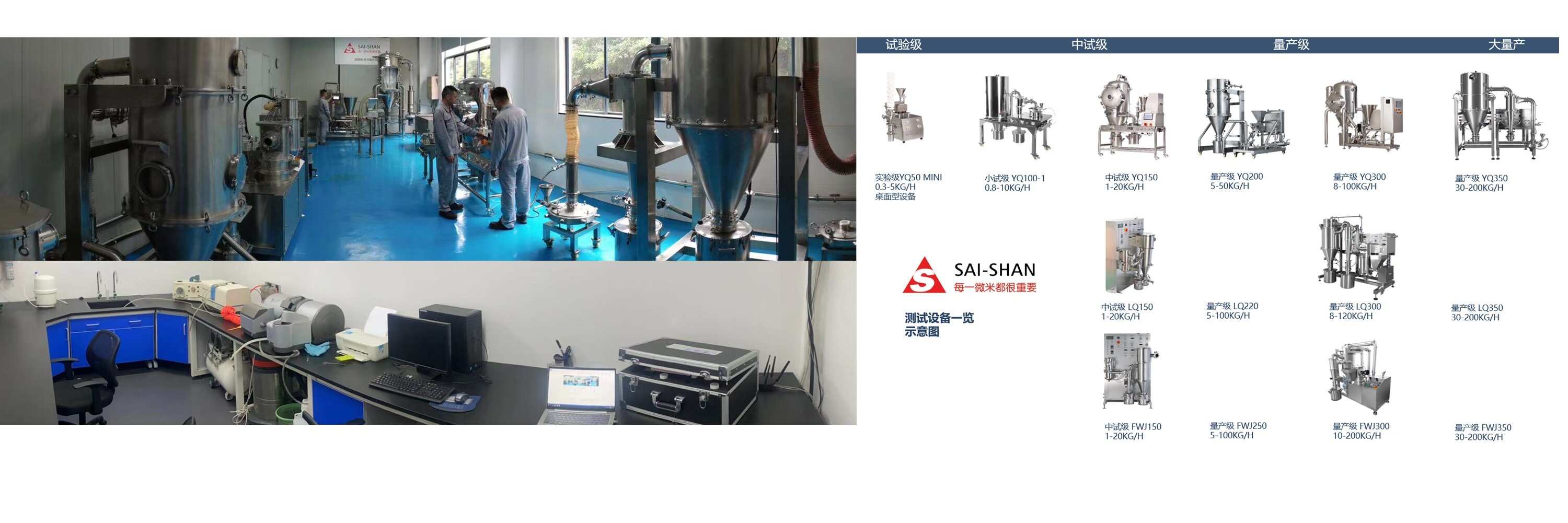 气流粉碎机: YQ50MINI试验级气流粉碎机 YQ100 试验级气流粉碎机 (PTFE内衬)(针对化学原料药) YQ100试验级气流粉碎机 (工业陶瓷内衬)(针对超硬物料) LQ150流化床气流粉碎机 YQ150 小试级气流粉碎机 (PEEK内衬)(针对化学原料药) (可使用氮气气源,针对防爆性能测试) YQ200中试级气流粉碎机 (可使用氮气气源,针对防爆性能测试) YQ300 量产级气流粉碎机 (PTFE内衬)(针对化学原料药) (可使用氮气气源,针对防爆性能测试) LQ300流化床气流粉碎机 YQ350量产级气流粉碎机 (工业陶瓷内衬)(针对超硬物料)