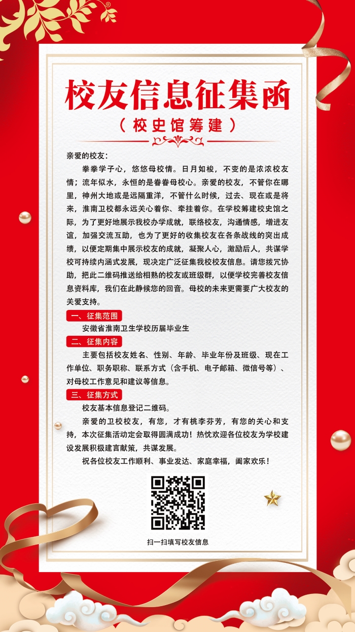 拳拳学子心,悠悠母校情。日月如梭,不变的是浓浓校友情;流年似水,永恒的是眷眷母校心。亲爱的校友,不管你在哪里,神州大地或是远隔重洋,不管什么时候,过去、现在或是将来,淮南卫校都永远关心着你、牵挂着你。在学校筹建校史馆之际,为了更好地展示我校办学成就,联络校友,沟通情感,增进友谊,加强交流互助,也为了更好的收集校友在各条战线的突出成绩,以便定期集中展示校友的成就,凝聚人心,激励后人,共谋学校可持续内涵式发展,现决定广泛征集我校校友信息。请您拨冗协助,把此二维码推送给相熟的校友或班级群,以便学校完善校友信息资料库,我们在此静候您的回音。母校的未来更需要广大校友的关爱支持。