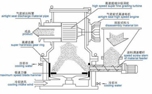 全新的设备设计方案,在一台设备上实现了气流粉碎,机械粉碎,高效涡轮分级机三种功能,集成了干法粉碎与分级的三种主流技术。该装备使得气流粉碎,机械粉碎,高效分级全性能的组合在了一起,让注重效率性能为先的研发小试阶段有了一个更为精良,高效的选择,同时让成本控制变得简单。 FWJ型机械超微粉碎机通常可以将成品物料粉碎至30-80微米(约:100-1250目)。设备通过设计在机体底部粉碎室的旋转刀盘与齿圈高速冲击物料,产生粉碎的效果。同时设计在设备顶部的卧式分级轮高速旋转所产生的离心力,与高压风机所产生向心力,相互作用分选成品物料的颗粒粒度位于底部的进风口进入大量空气,对机体部件进行降温,在引风机的作用下高温随空气被抽离设备,使物料有效避免与高温接触。成品物料在离开气流粉碎主机后,通过旋风分离器,除尘器完成物料回收,空气经过HEPA过滤器排空。