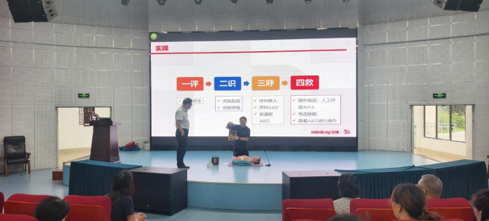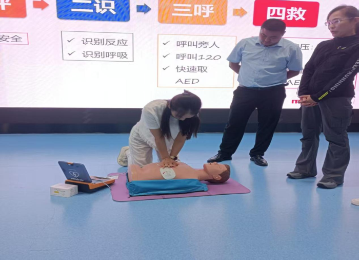 培训内容紧密围绕校园应急救护的实际需求展开。厂家技术人员首先详细讲解了心肺复苏(CPR)的基本操作流程、注意事项以及实施高质量CPR的关键要点,为AED的使用奠定了坚实基础。随后,重点介绍了AED设备的原理、功能、适用场景及操作步骤,通过模拟人教具逐步演示了从开机、粘贴电极片到分析心律、实施电击的全过程,并强调了使用过程中的安全事项。讲解结束后,参训人员在技术人员的指导下踊跃进行了模拟实操练习。